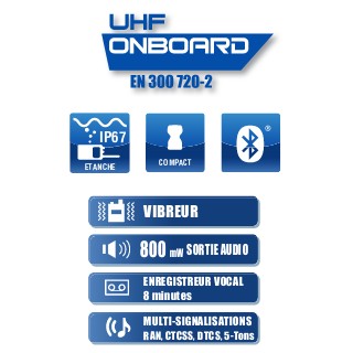 - Conforme à la règlementation des communications UHF ONBOARD (Norme EN 300 720-2)